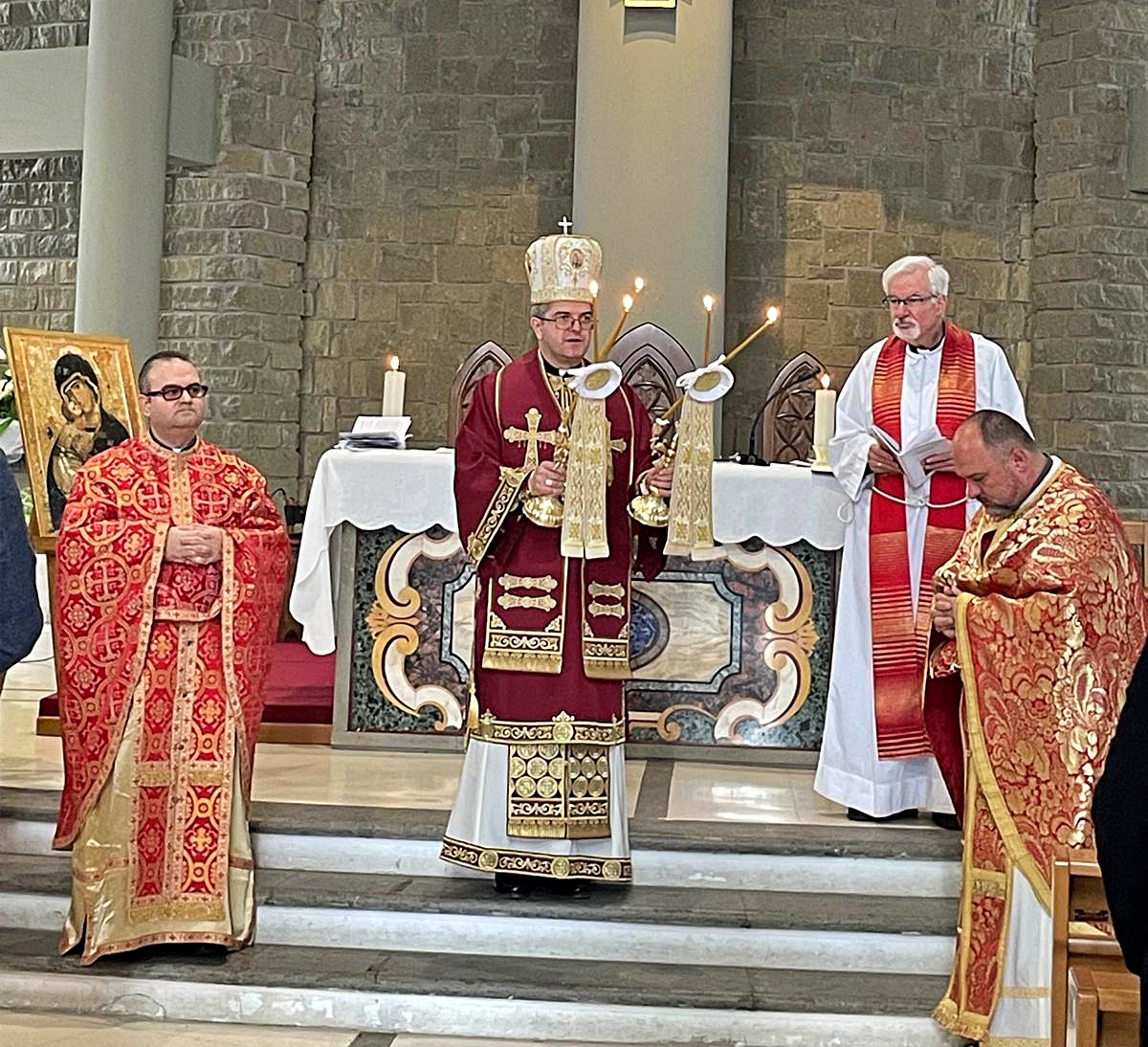 Sfânta Liturghie a fost celebrată de Preasfințitul Părinte Cristian Crișan, Vizitator apostolic pentru credincioșii greco-catolici români din Europa Occidentală. Prezența ierarhului a oferit sărbătorii o semnificație aparte, constituind un semn vizibil al comuniunii cu Biserica universală și al grijii pastorale pentru românii aflați în afara granițelor țării. Totodată, Preasfinția Sa a transmis salutul și binecuvântarea Preafericirii Sale Claudiu, întărind legătura vie de comuniune cu Biserica mamă.