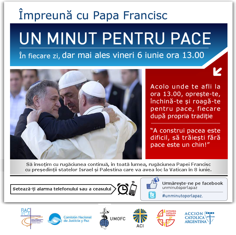 Acţiunea Catolică din România aderă pe deplin şi cu speranţă la „Un minut pentru PACE!” – o iniţiativă a  Acţiunii Catolice din Argentina  promovată la nivel mondial de Forumul Internaţional al Acţiunii Catolice (FIAC). Iniţiativa invită la rugăciune zilnică dar mai ales vineri, 6 iunie 2014, ora 13.00